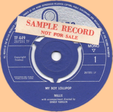 国際的にジャマイカの音楽"スカ"を広めたジャマイカ出身の女子歌手MILLIEの代表的シングル「My Boy Lollipop」。56年に米国の女子歌手BARBIE GAYEがリリースした楽曲をカヴァーしたもので、ISLANDレーベルの社長CHRIS BLACKWELLがカヴァーすることを提案、ジャマイカ屈指のギタリストERNEST RANGLINがアレンジを担当し、ロンドンのスタジオで録音したという。大ヒットシングル故にレーベルのヴァリエーションが多く、音楽出版社クレジットが"Copyright Control"と"Planetary Nom"の2種類あり、本盤は前者。"Copyright〜"は伝承歌のように版権元が不明な場合によく使用されるものだが、後者の方が圧倒的に見る故、米国の音楽出版元からクレームが来て訂正したのだろうか(本盤にはサンプルステッカーも貼ってあるし)。いずれにせよ録音された音源そのものは同じだが・・・