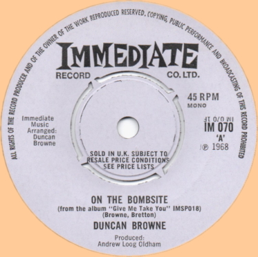 SSW系アーティストDUNCAN BROWNEの68年のデビューシングル。同年同月リリースのデビューアルバム『GIVE ME TAKE YOU』からのカット。数々の細かい音を紡いだ、非常に繊細な工芸品のような趣の逸品。デビュー前は"LAMDA"の略称で知られる名門"LONDON ACADEMY OF MUSIC AND DRAMATIC ART"で音楽理論と演劇を学んでいたという氏、そんな学業を見事に反映させた感がある。作曲とアレンジはBROWNE自身、プロデュースはレーベルオーナーANDREW LOOG OLDHAMが手掛けた。