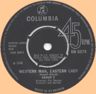 なんとも匿名性の高いグループ名だが、その正体はGROEP TWEEという南アフリカでは人気のポップス系デュオ。国際的な成功を夢見てか68年に渡英、かのアビーロードで数曲を録音、そのうちの2曲が本盤の収録曲となる。A面「It's Raining Outside」はアフリカ音楽の要素を取り入れたポップス、ここで紹介するのはそのB面「Western Man, Eastern Lady」。タイトルからなんとなく察しがつくように、オリエンタルな要素を取り入れたノヴェルティなポップス。近年では所謂サイケポップ的な評価を得ているとか。作曲はCARTER=LEWISとの仕事等でもお馴染みの米国の作曲家RUSELL ALQUIST。プロデュースを手掛けたBOB BARRATTはEMI系音源ではよく見る名前だが、アレンジを担当したPHIL DENNYSはDECCAやPYE、FONTANAにIMMEDIATE等数多くのレーベルで仕事をしている人。
