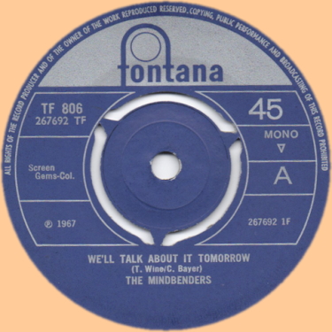 大ヒット「A Groovy Kind Of Love」でお馴染み、マンチェスター出身の人気グループMINDBENDERS。本盤は67年にリリースした、全く売れなかった1枚。先の大ヒット曲を作曲した米国の作曲チームのペンによるバラード作品。同じバラード作品でもこちらはえらく地味目な印象を受ける作風。確かに"良い曲"なんだけど、何か強烈なフレーズが欲しいというのは聴き手の生意気なわがままだろうか。67年という時代にリリースするのもやや古さを感じさせるが、実はこの曲、前年にIVANS MEADSなる同郷の新人グループがPARLOPHONEレーベルからリリースしていた曲(そちらも全く売れなかった)を取り上げたものだった。人気グループのシングルというだけでは売れないという現実の厳しさを突きつけるような1枚(そういう類のシングルは結構多いけど)。