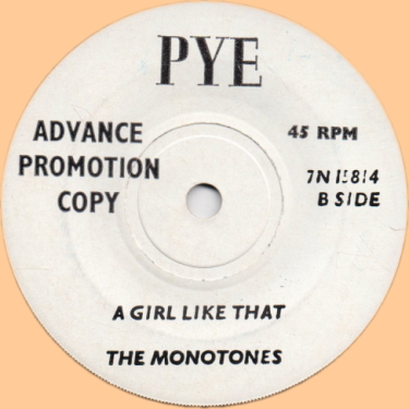 エセックス州出身のビートグループMONOTONES。64年にPYEからデビュー、本盤は65年リリースの4枚目にしてラストリリース。A面「Something's Hurtin' Me」は90年代以降にリリースされたビートサウンド系のコンピレーションCD数枚に収録されており、マイナービート系ファンにはお馴染みの1枚なのだろうか?一方B面「A Girl Like That」はその類のコンピレーションには無縁らしいのでここで紹介。こちらもA面同様に良い意味で垢抜けない典型的なマイナービート。とぼけた(?)ノリの上に結構エッジの効いたギターフレーズが乗った、なんとも言えない味わい深さがある。作曲はグループのベース奏者PETE STANLEYが手掛けている。