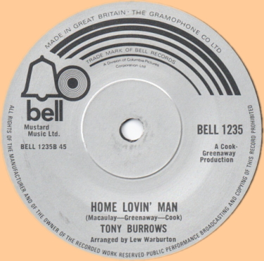 FLOWER POT MENにEDISON LIGHTHOUSE、WHITE PLAINS等のグループでリードヴォーカリストとして活動、大ヒットを飛ばしてきたセッション系歌手TONY BURROWS。が、いざ自身のソロ歌手として70年からBELLレーベルにて結構な枚数のシングルをリリースするも全く売れず。本盤はそのBELLでのラストシングル(1972年リリース)。A面は米国の人気ポップスグループTOKENSのヒット曲「Rhythm Of The Rain」を当時の流行のレゲエ調アレンジという安直なカヴァー。ここではそのB面「Home Lovin' Man」を紹介。こちらはTONY MACAULAYにCOOK=GREENAWAYという時の人気作曲家達による共作曲で、本盤の2年前に米国の人気スター歌手ANY WILLIAMSが歌い、英国ではチャート7位を記録したもの。ゆったりグルーヴィなベースとドラムにややサイケ/プログレっぽさも感じさせるオルガンを軸としたアレンジに人気作曲者達が紡いだ美しいメロディを優しく歌い上げた、こちらもなかなか素敵な仕上がり。なんでも元々はBURROWS自身がANDY WILLIAMSの前にこの作品の仮歌デモを録音していたそうだが・・・心境やいかに??