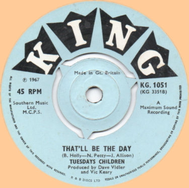 70年代にマルチなミュージシャンとしてブレイクするPHIL CORDELLが在籍していたサイケロック系グループTUESDAY'S CHILDREN。66年にCOLUMBIAからデビューし2枚のシングルをリリース、翌年には都落ち(?)でマイナーレーベルKINGに移籍、本盤をリリースすることになる。A面「A Strange Light From East」はCORDELLが作曲、オリエンタルなサイケロック、ここではそのB面「That'll Be The Day」を紹介。こちらは米国の人気R&R歌手BUDDY HOLLYの作品のカヴァー、ワイルドなギターやホーンを導入した、60年代後半らしいアレンジでの録音。英国では死後も多くの音源が長い間リリースされてHOLLYは人気を誇っていたが、本盤の選曲もそうしたことも反映されているのだろうか?録音場所のMAXIMUM SOUNDはスカやロックステディ等ジャマイカ音楽を多く録音していたスタジオで、本盤のプロデューサーの1人、VIC KEARYはレゲエ系リスナーにはお馴染みの人。