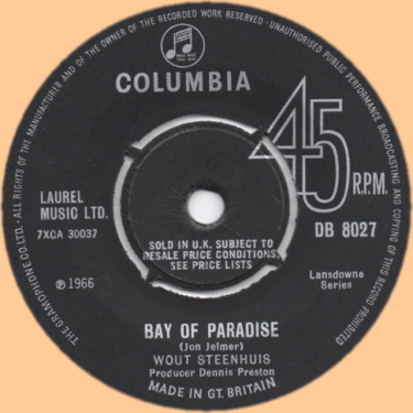 オランダ出身、ギターを中心にマルチに楽器を演奏するWOUT STEENHUIS。40年代後半に英国に渡り、ラジオ関係の音楽の仕事をしていた氏。63年にはレコードプロデューサーDENIS PRESTONと契約を交わし、同年から自身のレコードのリリースを開始、本盤は66年にリリースされた1枚。A面「Nivram」はレーベルメイトで人気インストグループSHADOWSがアルバム収録曲としてリリースした曲のカヴァー、ここではそのB面「Bay Of Paradise」を紹介。こちらはSTEENHUIS自身の作曲による(JON JELMER名義)オリジナル曲。ゆったりしたテンポにハワイアン風スティール・ギターが心地良く乗ったインスト作品。前半では控えめに配されたストリングスも後半から流麗かつラウドに曲中を舞う。それまでにも自作のハワイアン調インストを作ってきていただけあってこの手のサウンドはお手の物。プロデュースは先のPRESTON(レーベルのクレジットはDENISではなくDENNISとなっている)、録音はPRESTON所有のスタジオLANSDOWNE STUDIOにて。