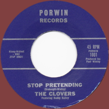 ワシントンDCで結成、50年代にはATLANTICレーベルでヒットを飛ばし人気を博したドゥーワップ/R&BグループCLOVERS。ATLANTIC退社後にはUNITIED ARTISTSに移籍、その後はメンバーチェンジを経て61年に解散した彼等。が、メンバーBUDDY BAILEYを中心に再編しマイナーレーベルで地味にシングルをリリース、本盤は63年にメンバーHAROLD WINLEYの実兄PAUL WINLEYの自主レーベルPORWINからのリリース。A面「One More Time」はダンサブルなゴスペル感覚溢れるR&B作品、ここではそのB面「Stop Pretending」を紹介。こちらは彼等の得意とする、ドゥーワップ系グループが歌いそうな甘いバラード作品で、オルガンを入れたモダンな質感の伴奏にゴスペル直系のリードヴォーカルがソウルフルな歌唱を聴かせる素敵な仕上がりとなっている。作曲はPAUL WINLEYとメンバーNATHANIEL BOUKNIGHT(本盤のレーベル表記は"BROKNIGHT")による。