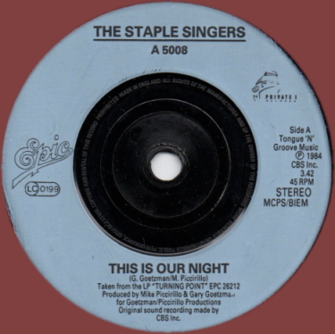 ミシシッピ出身、ゴスペル歌手/ギタリストROEBUCK "POPS" STAPLESが息子、娘達と40年代に結成したゴスペルグループSTAPLE SINGERS。60年代に入るとソウル/R&Bの世界に入り、ゴスペルとソウル/R&Bをミックスさせた独自のサウンドで人気を博した。本盤は彼等の85年リリースの1枚。前年にリリースされたアルバム『THE TURNING POINT』からのカット。この時代らしい、シンセサイザーを駆使したアーバンなソウル作品だが、それに乗った彼等の歌唱は昔ながらの人間味溢れるソウルフルな印象を与えて興味深い。作曲は70年代後半からソウル/ファンク系のアーティスト達に楽曲提供していたGARY GOETZMANとMIKE PICCIRILLOのチームによる。ちなみに本盤は英国配給盤で、原盤の米盤は1か月前の84年の12月にPRIVATE Iというレーベルからリリースされている。